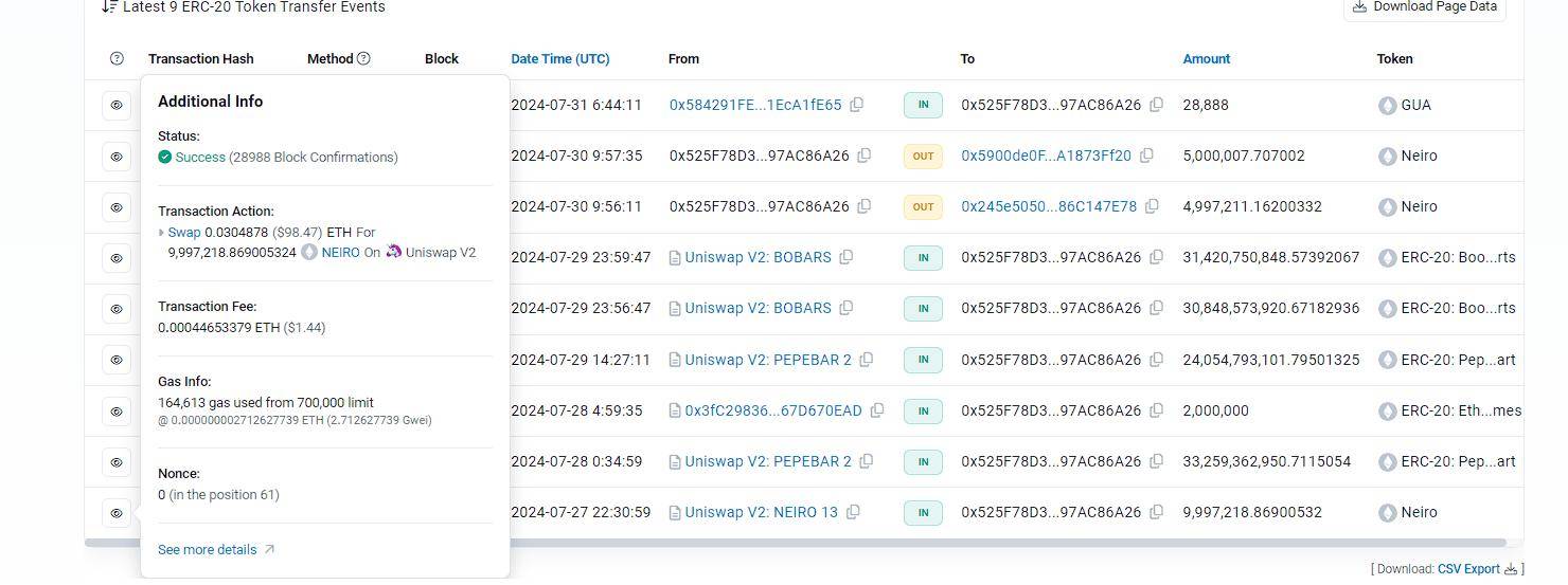 不过,PANews追踪所查到的Cointool混币平台发现,这个平台的功能就包含批量生成钱包、批量转账及批量自动购买等功能。开发者可以轻松的利用这些功能伪装成数十个购买地址,并在同一时间买进。以0x525F78D35De309f0f53311C5A69370597AC86A26这个地址为例,花费约100美元购入999.7万枚NEIRO代币,目前价值约为150万美元,回报率约为14925倍。随后将代币分为两笔转至两个地址。截至8月1日,大多数的地址中的NEIRO代币仍未售出,一方面或许是为了不引起注意(毕竟目前持仓0.5%的金额也接近75万美元),另一方面,操作人员还未向这些分仓后的地址转入以太坊代币支付交易的Gas。