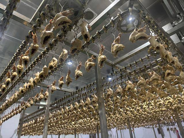 透过二楼玻璃向内望,一排排金属架上悬挂的待加工烧鸡鳞次栉比,蔚为壮观。当天,这些烧鸡便会出现在各式各样的餐桌上,无论是家庭温馨的小聚,还是商务宴请的正式场合。