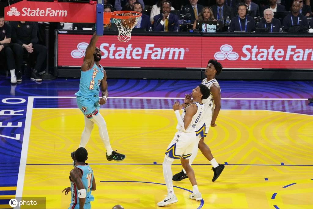 比赛开打后,由于没有内线可用,老将全明星队将杜兰特临时安排到了中锋的位置上。在球星等级上,两支队伍相差不少,可真正比赛开打,却是新秀队的乔治率先命中三分球。老兵队这边也不含糊,库里、塔图姆、利拉德和哈登轮番上分,成功将比分反超。库里不讲理的三分球,一度引来主场观众欢呼。